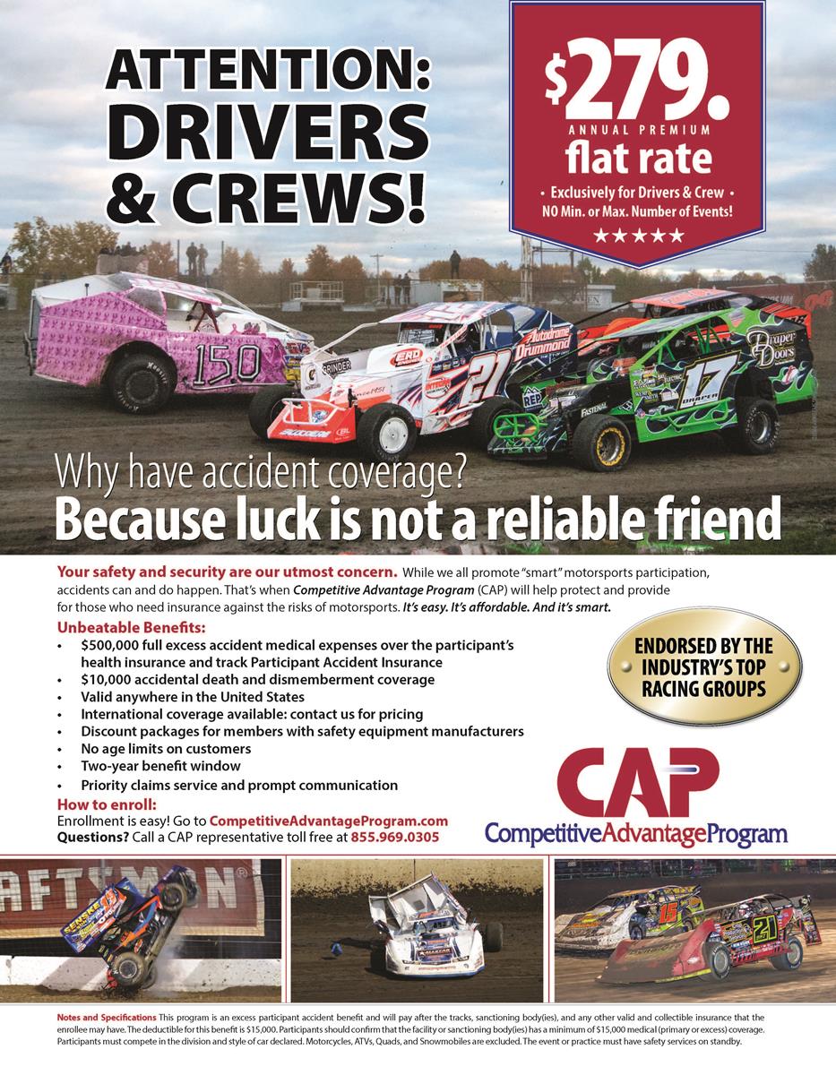 Your safety and security are our utmost concern, but we are aware that accidents can and do happen. Competitive Advantage program is designed to help protect and provide for those who need insurance against the risk of motorsports events. If you have not already reviewed the CAP policy information Click Here https://www.competitiveadvantageprogram.com/#risk